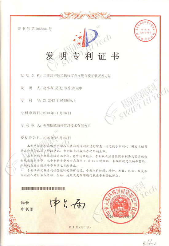 發(fā)明專利證書:二維超聲波風速儀零點在線自校正裝置及方法