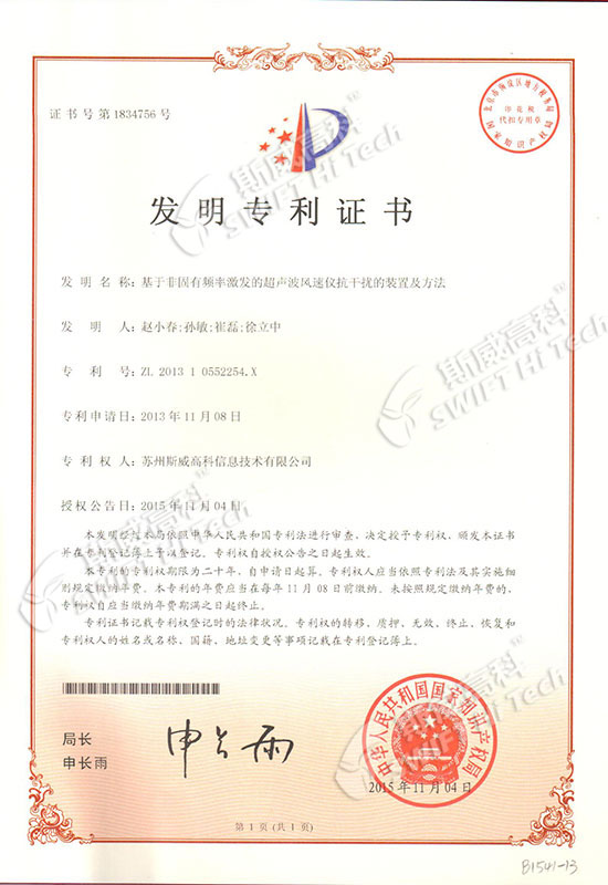 發(fā)明專利證書:基于非固有頻率激發(fā)的超聲波風速儀抗干擾的裝置及方法