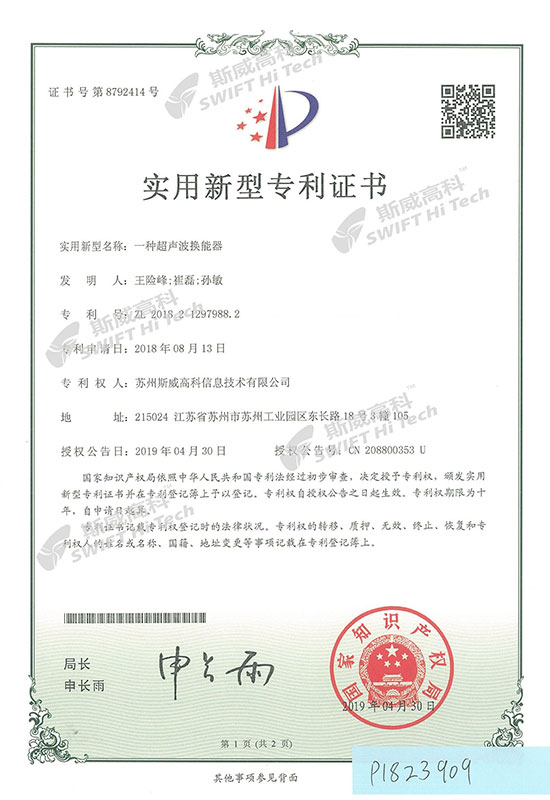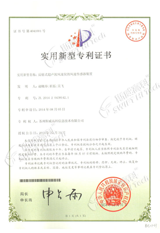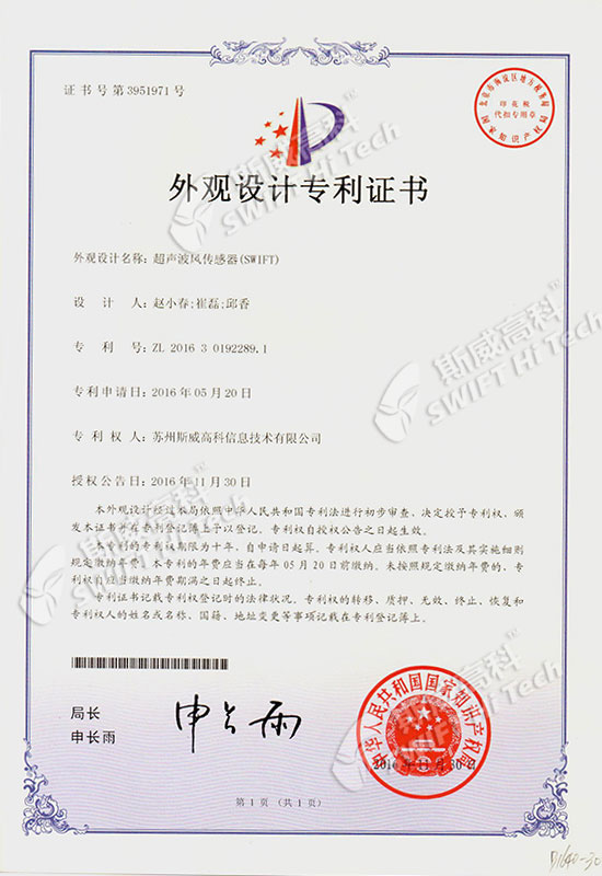 外觀設(shè)計專利證書:超聲波風傳感器(SWIFT V3.0)