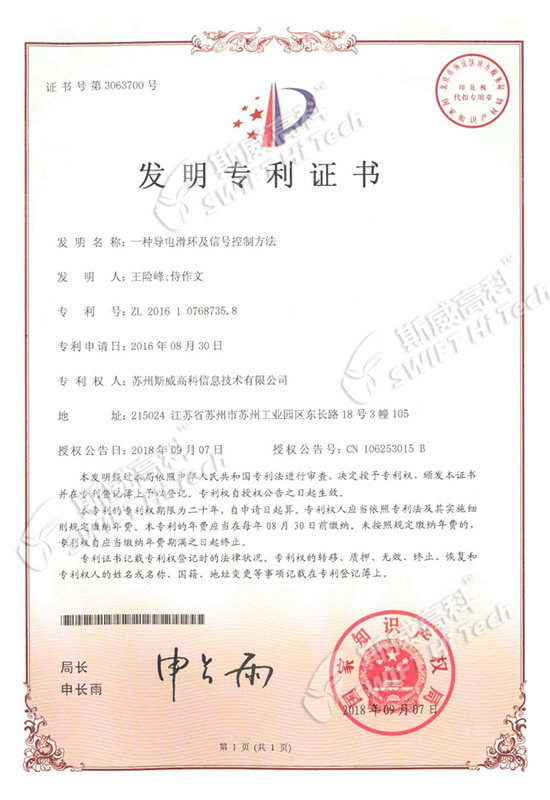 發(fā)明專利證書:一種導電滑環(huán)及信號控制方法