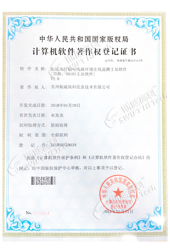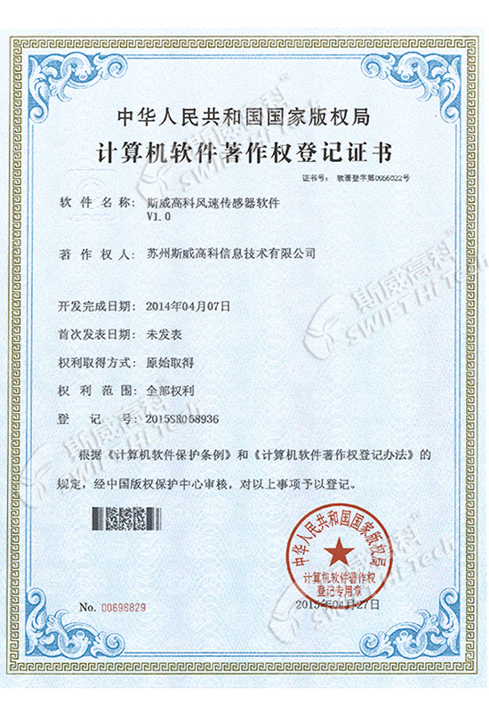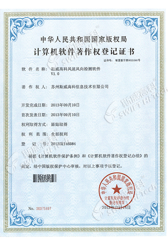 斯威高科風速風向檢測軟件V1.0 登記證書