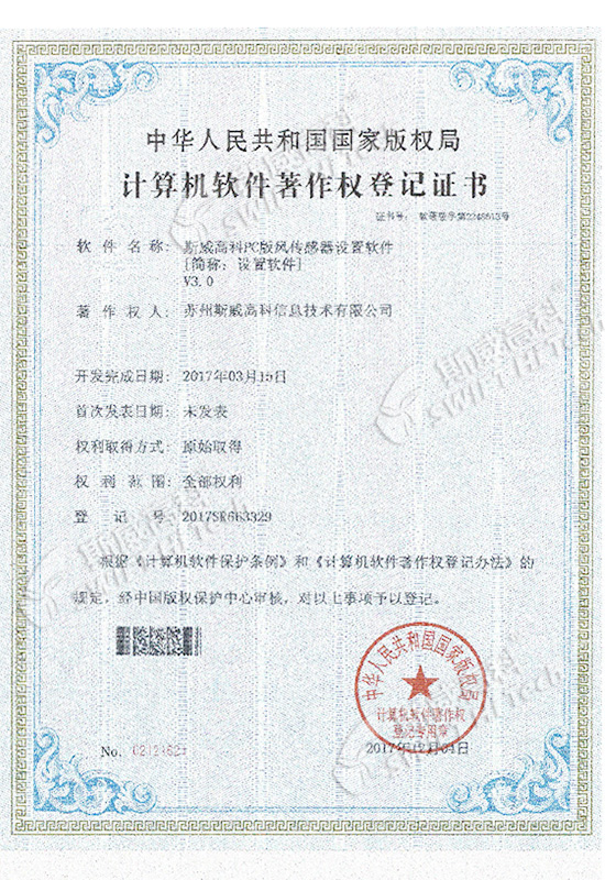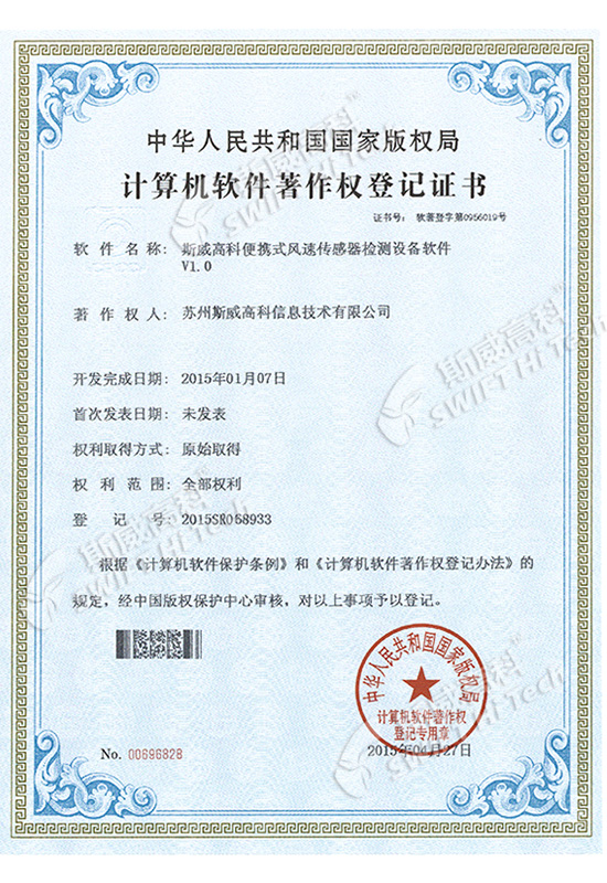 斯威高科便攜式風速傳感器檢測設(shè)備軟件V1.0 登記證書