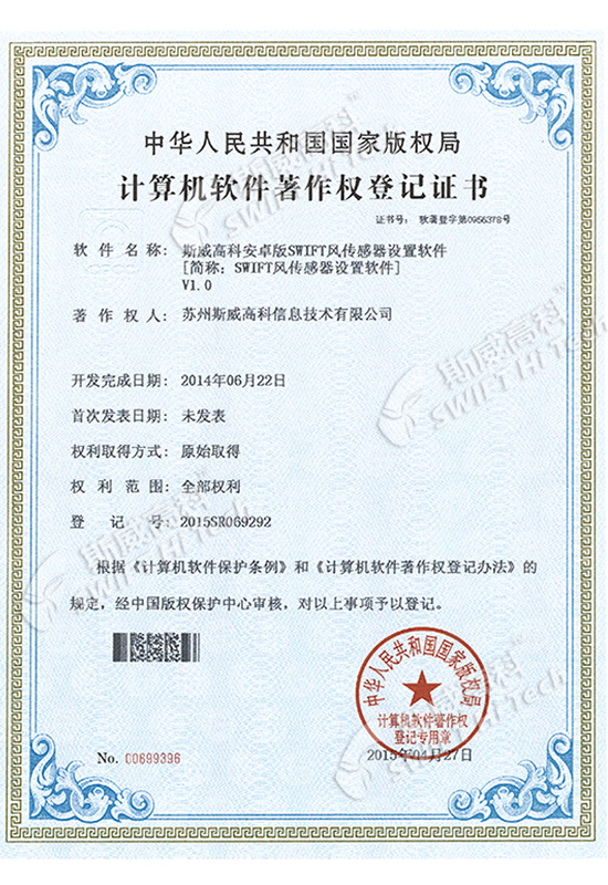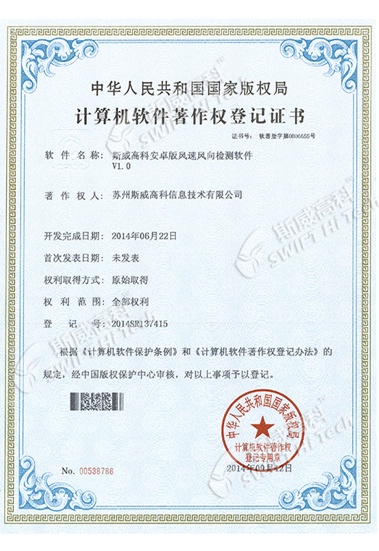 斯威高科安卓版風速風向檢測軟件V1.0 登記證書