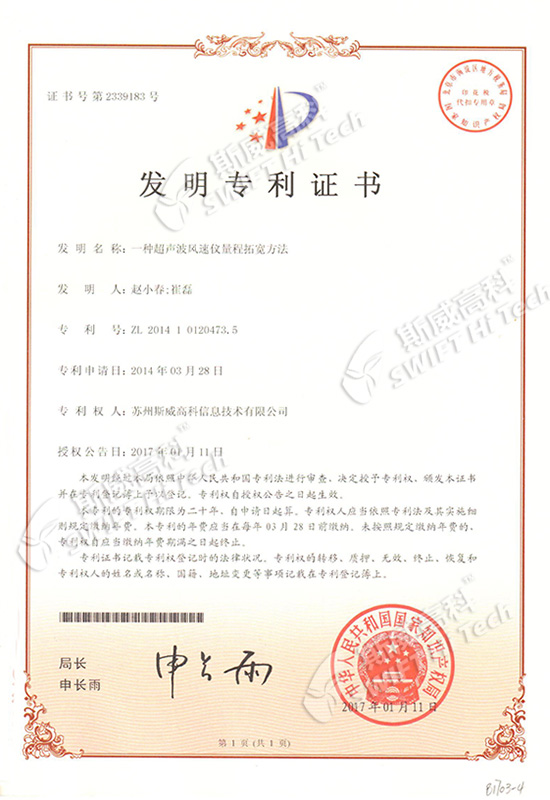 發(fā)明專利證書:一種超聲波風速儀量程擴寬方法