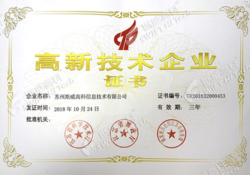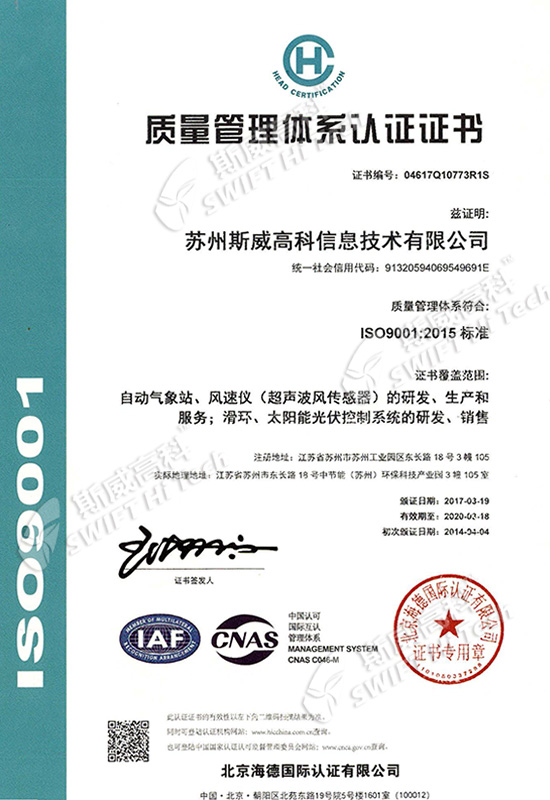 蘇州斯威高科信息技術(shù)有限公司 質(zhì)量管理體系認證證書