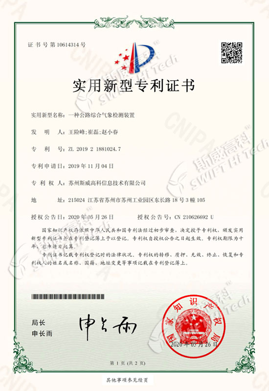實用新型專利證書:一種公路綜合氣象檢測裝置